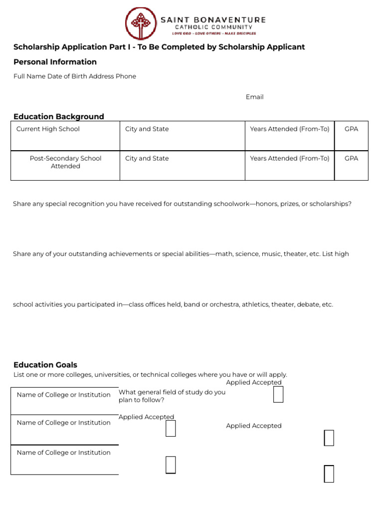 Saint Bonaventure Scholarship Application Fillable PDF Confirmation